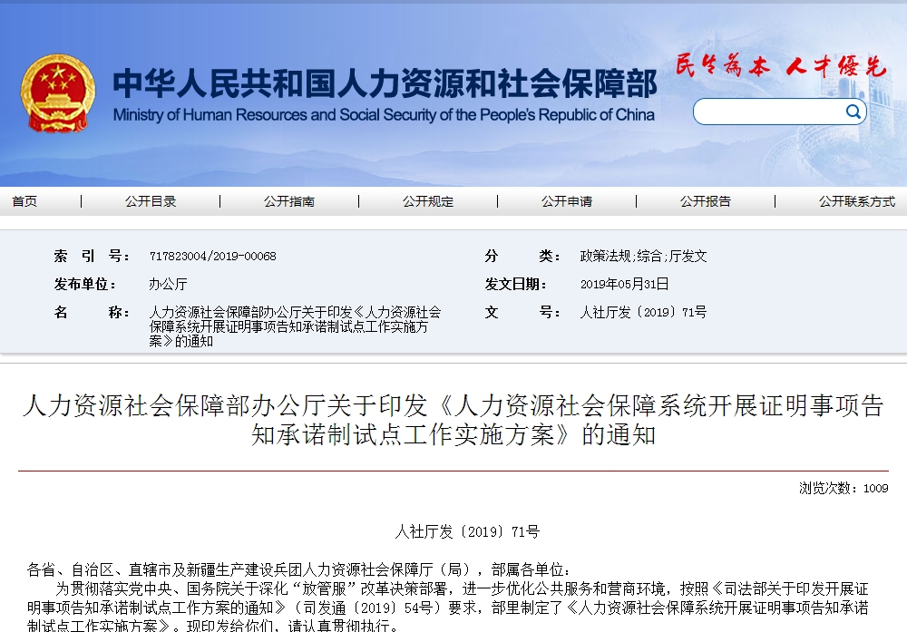 2019年5月31日人力資源社會(huì)保障部印發(fā)《人力資源社會(huì)保障系統(tǒng)開(kāi)展證明事項(xiàng)告知承諾制試點(diǎn)工作實(shí)施方案》的通知,確定在6項(xiàng)社會(huì)保險(xiǎn)經(jīng)辦和12項(xiàng)專(zhuān)業(yè)技術(shù)人員資格考試報(bào)名共18項(xiàng)政務(wù)服務(wù)中開(kāi)展證明事項(xiàng)告知承諾制試點(diǎn),7月前完成全面啟動(dòng)。