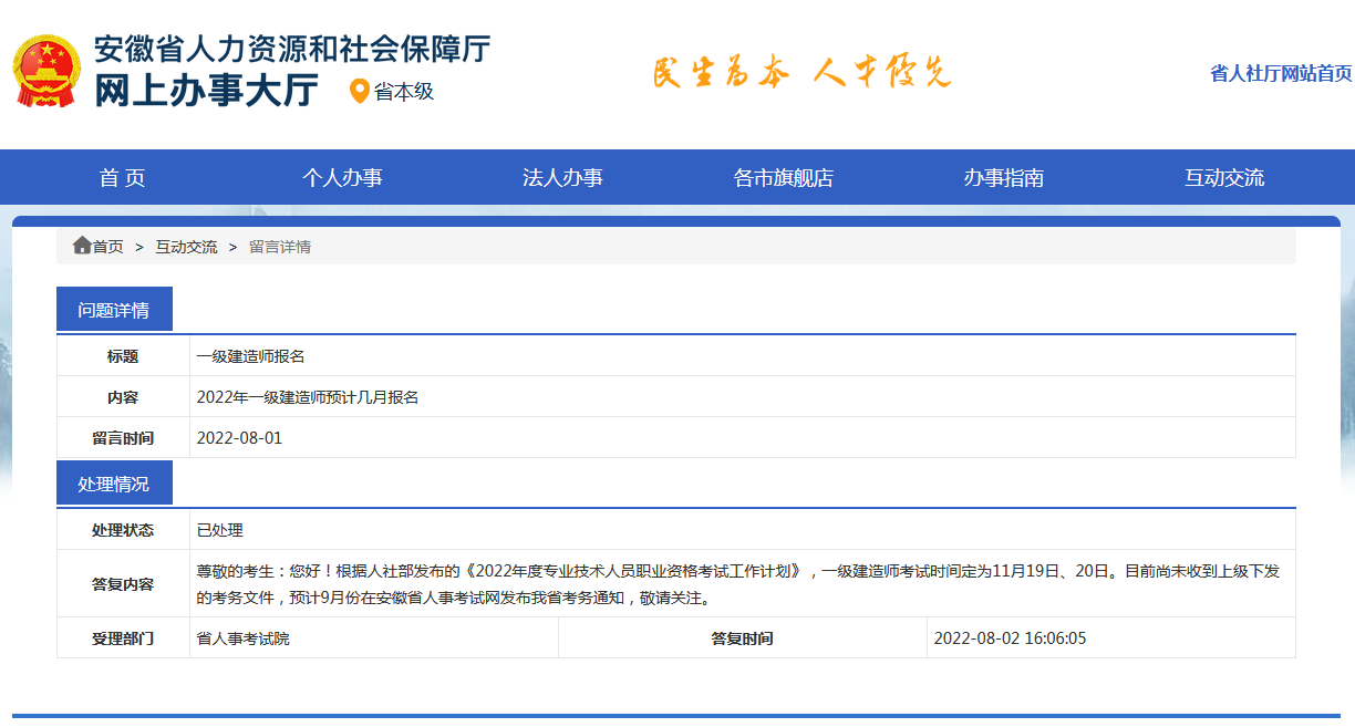 2022年一級(jí)建造師考試時(shí)間遲遲沒有公布,相比往年已經(jīng)晚了一些。近期有學(xué)員朋友在安徽省人力資源和社會(huì)保障廳網(wǎng)上辦事大廳咨詢了報(bào)名時(shí)間,官方回復(fù):“目前尚未收到上級(jí)下發(fā)的考務(wù)文件,預(yù)計(jì)9月份在安徽省人事考試網(wǎng)發(fā)布我省考務(wù)通知,敬請(qǐng)關(guān)注?!?br/>