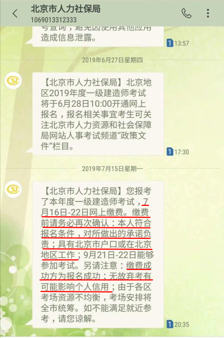 根據(jù)北京人事考試網(wǎng)發(fā)布的通知,北京2019年一級建造師報名網(wǎng)上繳費時間為7月16-22日。北京市人社局短信提醒廣大考生在網(wǎng)上繳費前務必確認本人符合報名條件、對所做出的的承諾負責、具有北京市戶口或在北京地區(qū)工作,繳費成功方為報名成功。