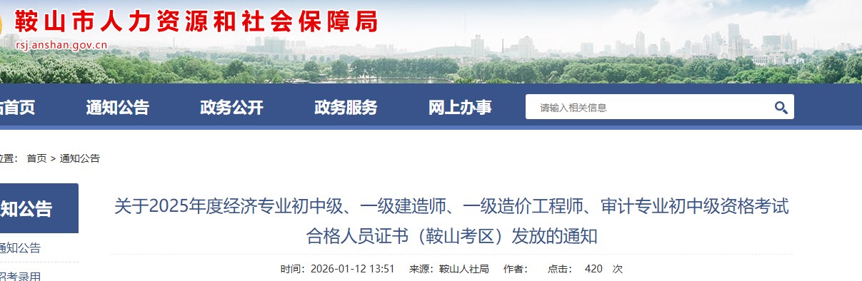 2025年度經(jīng)濟(jì)專(zhuān)業(yè)初中級(jí)、一級(jí)建造師、一級(jí)造價(jià)工程師、審計(jì)專(zhuān)業(yè)初中級(jí)資格考試合格人員證書(shū)(鞍山考區(qū))定于2026年1月13日開(kāi)始發(fā)放,現(xiàn)將有關(guān)工作安排通知如下: