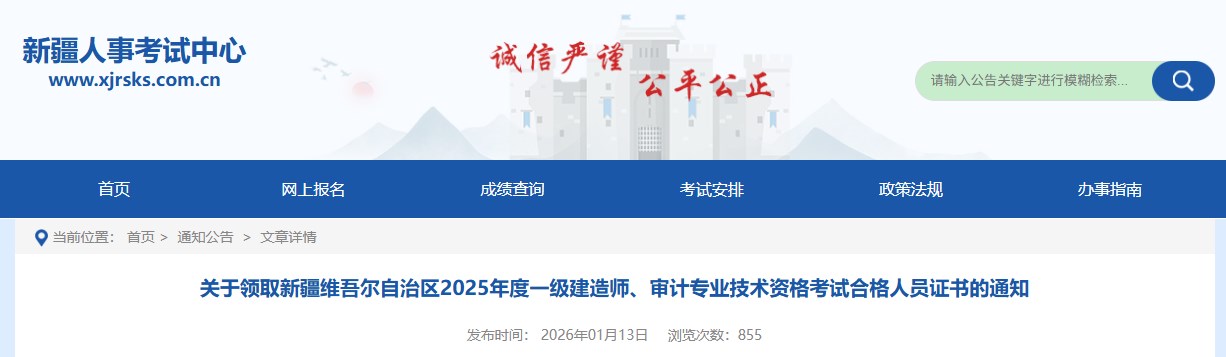 新疆人事考試中西發(fā)布關(guān)于領(lǐng)取新疆維吾爾自治區(qū)2025年度一級建造師、審計專業(yè)技術(shù)資格考試合格人員證書的通知,具體信息如下: