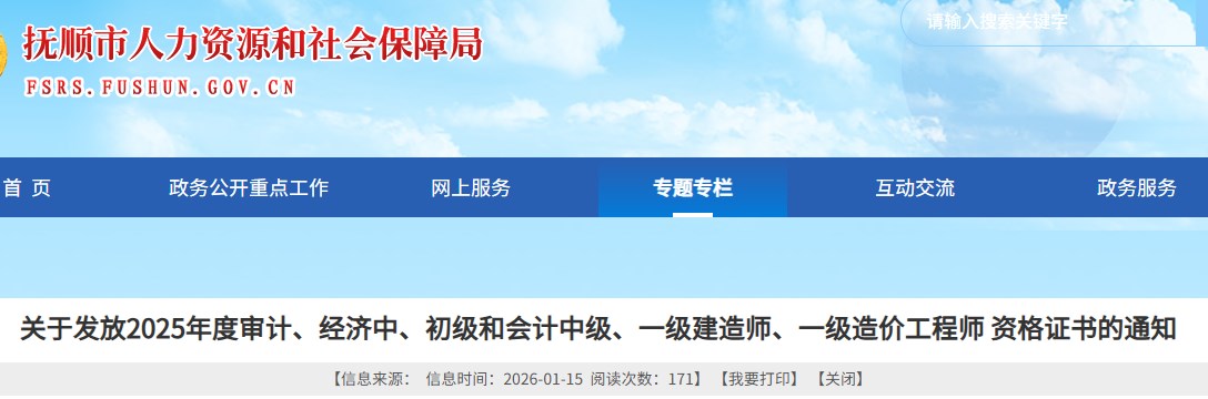 撫順市發(fā)布關(guān)于發(fā)放2025年度一級(jí)建造師資格證書的通知