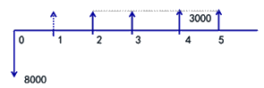 『答案解析』本題考查的是技術(shù)方案經(jīng)濟(jì)效果評(píng)價(jià)。其中,財(cái)務(wù)凈現(xiàn)值、(靜態(tài))投資回收期分別是評(píng)價(jià)盈利能力的動(dòng)態(tài)和靜態(tài)指標(biāo)。根據(jù)題意,以及凈收益均發(fā)生在運(yùn)營(yíng)期的年末,可以繪制以下的現(xiàn)金流量圖: