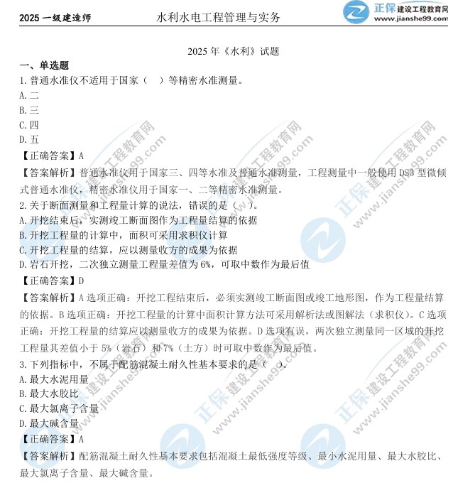 2025年一級建造師《水利工程管理與實務》考試過后,廣大考生最關心2025一級建造師《水利工程管理與實務》試題及答案,建設工程教育網考后將會根據學員反饋,及時匯總2025年一級建造師《水利工程管理與實務》試題及答案分享給大家,并且會及時做出答案解析,希望能為廣大咨詢考生朋友帶來幫助。