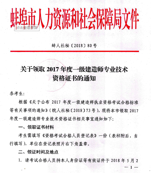 安徽蚌埠市2017年度一級建造師合格證書領(lǐng)取通知