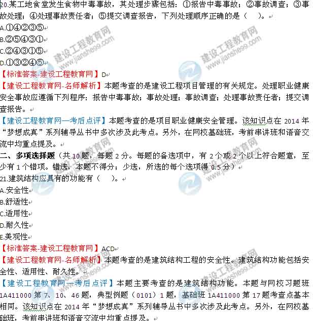 2014一級建造師建筑工程管理與實務(wù)答案及解析由老師整理而成,部分網(wǎng)站未經(jīng)許可擅自轉(zhuǎn)載、抄襲,造成內(nèi)容有所缺失或錯誤,請大家以建設(shè)工程教育網(wǎng)發(fā)布為準(zhǔn)!