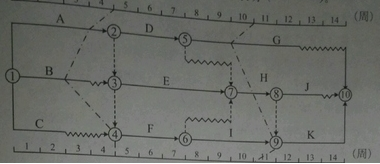 94.某工程項(xiàng)目的雙代號(hào)時(shí)標(biāo)網(wǎng)絡(luò)計(jì)劃,當(dāng)計(jì)劃執(zhí)行到第4周末及第10周末時(shí),檢查得出實(shí)際進(jìn)度前鋒線如下圖所示,檢查結(jié)果表明( )。