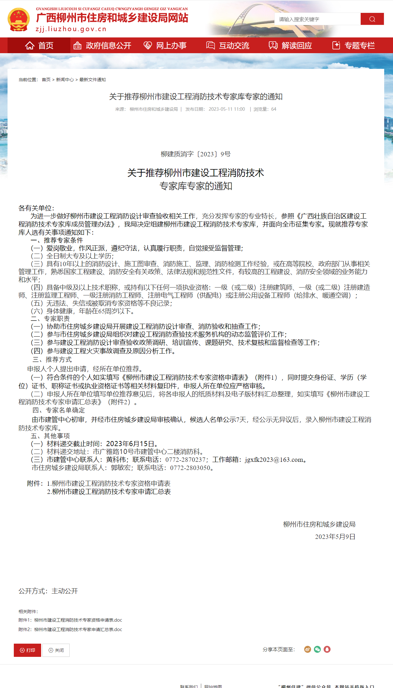 5月9日,柳州市住房和城鄉(xiāng)建設(shè)局發(fā)布“關(guān)于推薦柳州市建設(shè)工程消防技術(shù)專家?guī)鞂<?/span>的通知”。