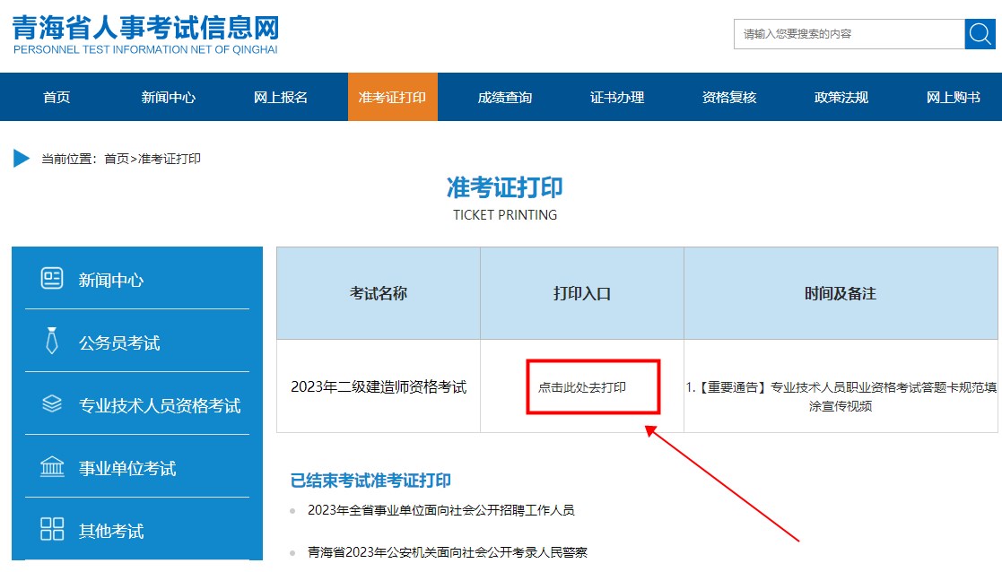 青海2023年二級建造師考試準考證打印入口:青海人事考試信息網