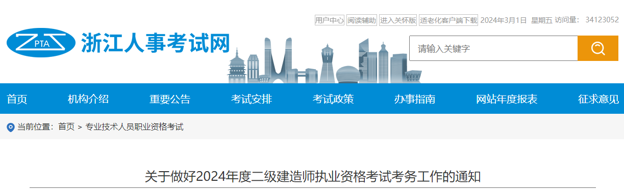 根據(jù)住房和城鄉(xiāng)建設部執(zhí)業(yè)資格注冊中心《關于提供2024年度二級建造師執(zhí)業(yè)資格考試服務的說明》以及省人力社保廳《關于印發(fā)2024年度專業(yè)技術人員職業(yè)資格考試工作計劃的通知》(浙人社辦函〔2024〕16號)和省人力社保廳、省建設廳《關于規(guī)范完善二級建造師執(zhí)業(yè)資格有關制度的通知》(浙人社發(fā)〔216〕8號)文件精神,現(xiàn)將我省2024年度二級建造師執(zhí)業(yè)資格考試考務工作有關事項通知如下。