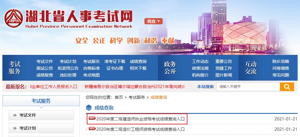 2020年湖北二級(jí)建造師考試成績(jī)查詢網(wǎng)站:湖北省人事考試網(wǎng)