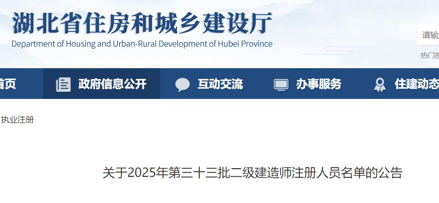 湖北省住房和城鄉(xiāng)建設(shè)廳發(fā)布:關(guān)于2025年第三十三批二級建造師注冊人員名單的公告,具體內(nèi)容如下: