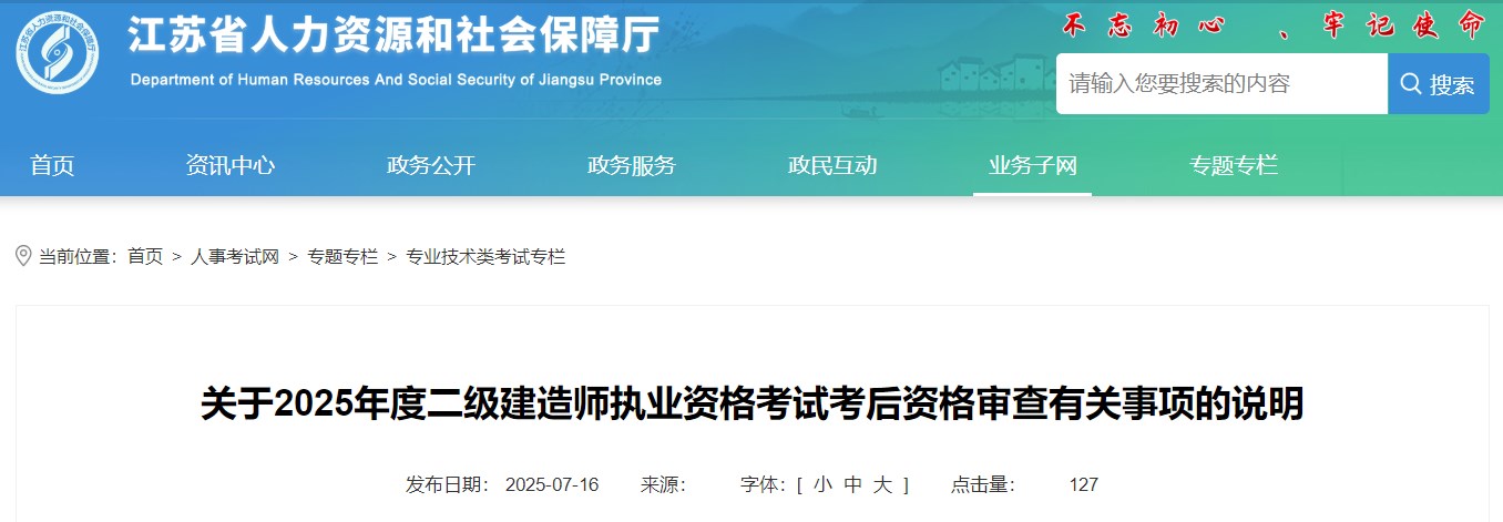 江蘇省人力資源和社會保障廳發(fā)布關(guān)于2025年度二級建造師執(zhí)業(yè)資格考試考后資格審查有關(guān)事項的說明,具體信息如下:
