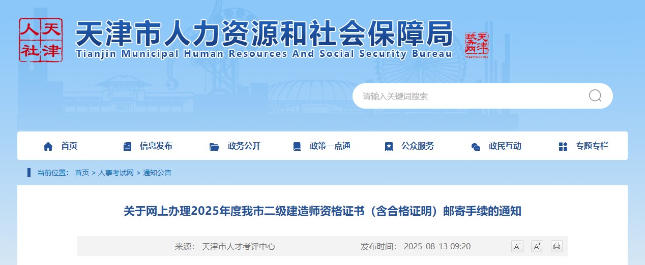 天津市人力資源和社會(huì)保障局發(fā)布關(guān)于網(wǎng)上辦理2025年度我市二級(jí)建造師資格證書(shū)(含合格證明)郵寄手續(xù)的通知,具體信息如下: