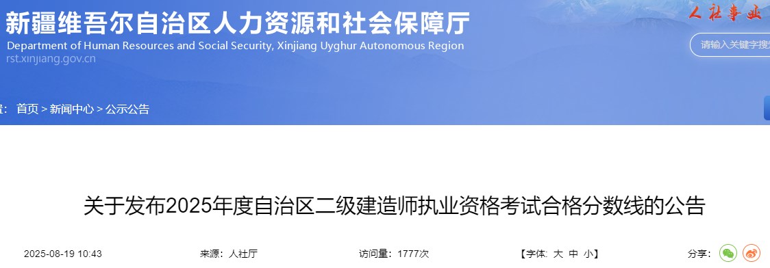 新疆維吾爾自治區(qū)人力資源和社會保障廳發(fā)布關(guān)于發(fā)布2025年度自治區(qū)二級建造師執(zhí)業(yè)資格考試合格分?jǐn)?shù)線的公告,具體信息如下: