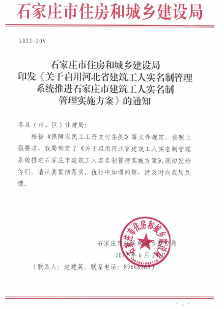 印發(fā)《關(guān)于啟用河北省建筑工人實名制管理系統(tǒng)推進(jìn)石家莊建筑工人實名制管理實施方案》的通知