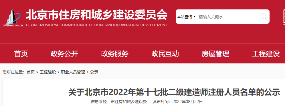 關(guān)于北京市2022年第十七批二級建造師注冊人員名單的公示