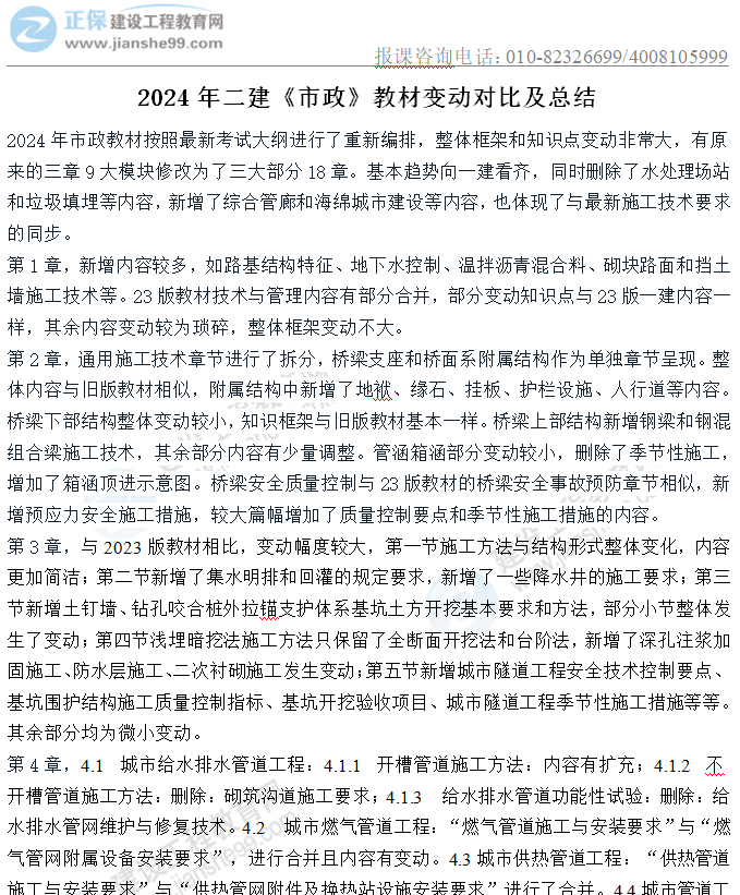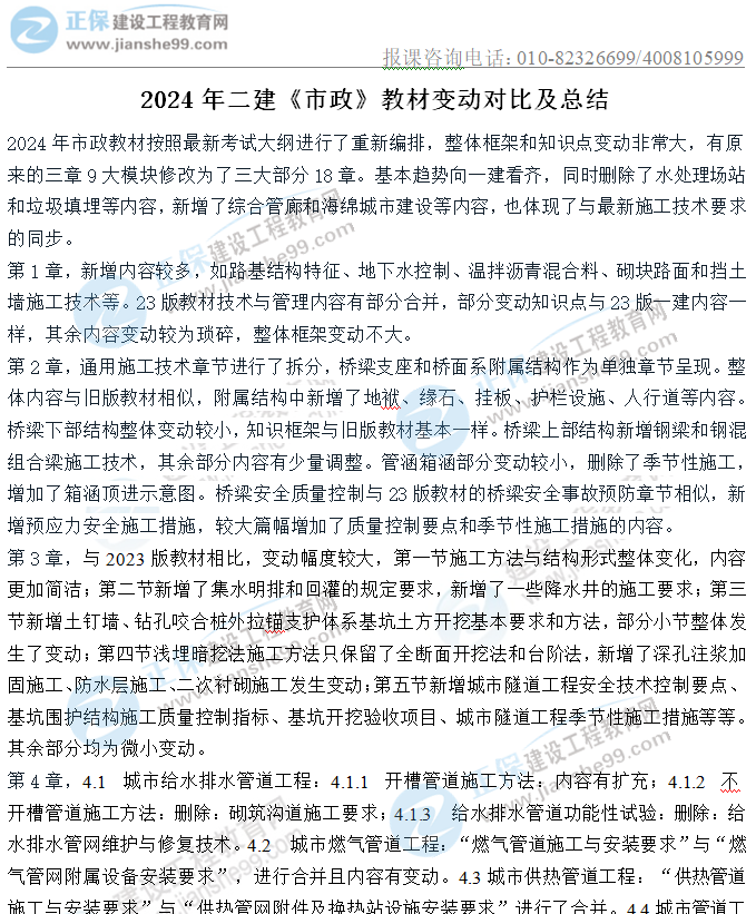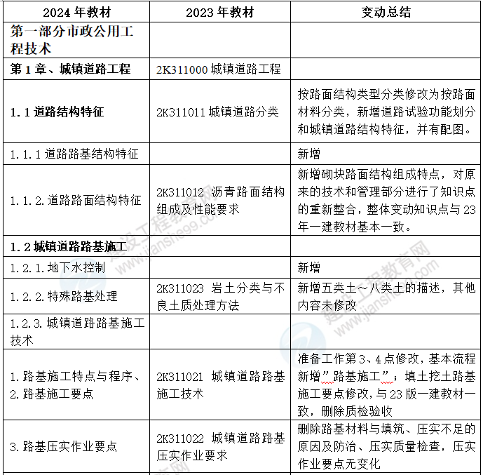 2024年二級建造師市政實務教材變動情況表預覽