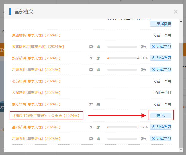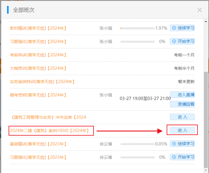 登錄后進(jìn)入【我的網(wǎng)校我的家】--查看【我的課程】--點(diǎn)擊【全部班次】找到案例100問(wèn)--點(diǎn)擊【進(jìn)入】即可查看或下載