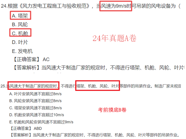 考點(diǎn)詳解:當(dāng)風(fēng)速大于制造廠家的規(guī)定時(shí),不得進(jìn)行塔架、機(jī)艙、風(fēng)輪、葉片等部件的吊裝作業(yè)。制造廠家未規(guī)定安裝風(fēng)速的,葉片和風(fēng)輪安裝風(fēng)速不宜超過8m/s,塔架、機(jī)艙安裝風(fēng)速不宜超過10m/s。