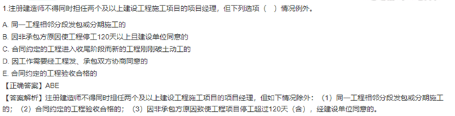 注冊建造師不得同時擔(dān)任兩個及以上建設(shè)工程施工項目的項目經(jīng)理,但如下情況除外:(1)同一工程相鄰分段發(fā)包或分期施工的;(2)合同約定的工程驗收合格的;(3)因非承包方原因致使工程項目停工超過120天(含),經(jīng)建設(shè)單位同意的。
