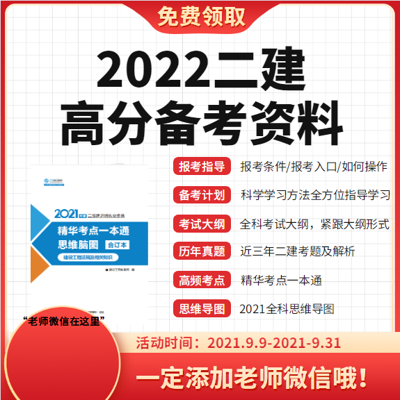 2022二級(jí)建造師備考資料免費(fèi)相送,掃碼領(lǐng)取.沒有套路,所有資料全部免費(fèi)。9月開始二建成績(jī)陸續(xù)公布,更是開始備考的時(shí)間節(jié)點(diǎn)。備考快人一步,考試通過輕松,備考資料更是必不可少。二級(jí)建造師考試必備資料是由建設(shè)工程教育網(wǎng)教研團(tuán)隊(duì)精心匯編,包含各科目考試重點(diǎn)及難點(diǎn),還有知識(shí)點(diǎn)思維導(dǎo)圖,報(bào)考指導(dǎo)資料,全年備考計(jì)劃,歷年試題解析等等。網(wǎng)校同時(shí)提醒廣大考生抓緊時(shí)間學(xué)習(xí),快人一步備考。資料在手,考試無憂!