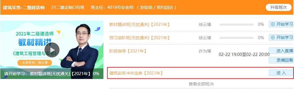 超值精品班學員也不要著急,“我的網(wǎng)校我的家”點擊“班次升級”,可升級為高效實驗班、無憂直達班,享受更多優(yōu)質(zhì)教學服務和考試資料!