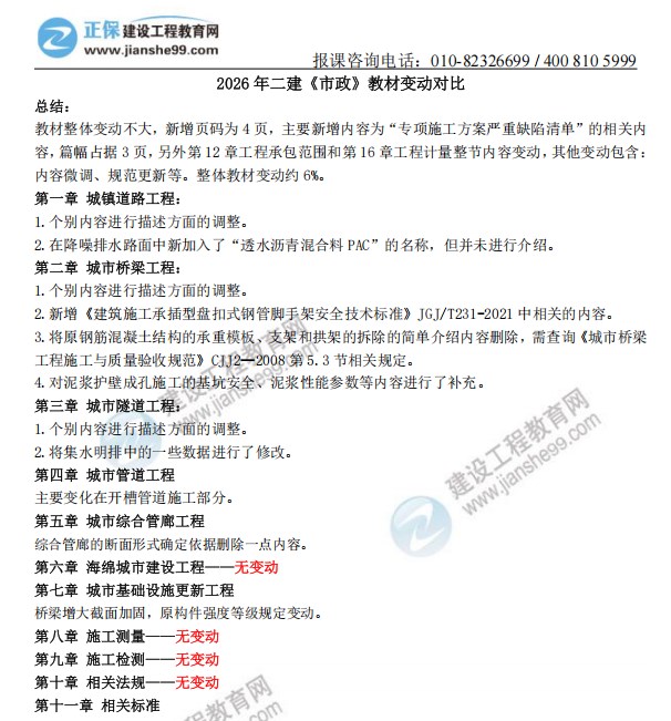 2026年二級建造師《市政實(shí)務(wù)》新教材變動(dòng)梳理出爐!建設(shè)工程教育網(wǎng)教務(wù)團(tuán)隊(duì)拿到教材后第一時(shí)間為大家梳理變動(dòng)詳細(xì)內(nèi)容,經(jīng)核對,2026年市政實(shí)務(wù)科目整體變動(dòng)約6%,教材變動(dòng)內(nèi)容如下,更多變動(dòng)解讀請關(guān)注8月27日19:00田洋老師直播間!