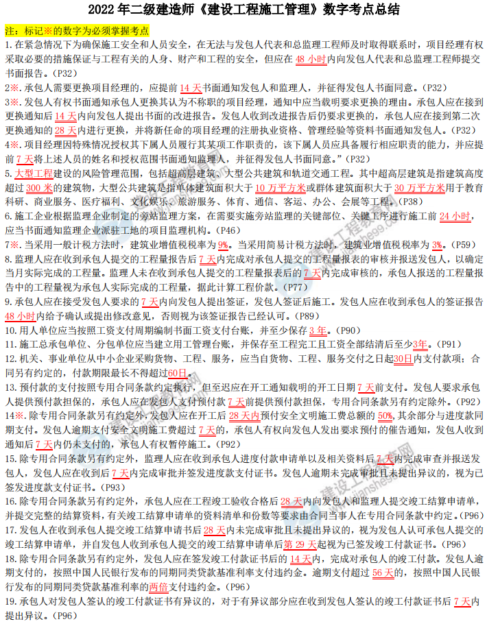 2022二級建造師施工管理數(shù)字考點總結(部分截圖)