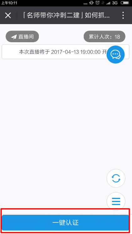步驟3: 點(diǎn)擊“進(jìn)入”按鈕進(jìn)入“二建考前沖刺”直播間。(第一次進(jìn)入,點(diǎn)擊頁面下方“一鍵認(rèn)證”)