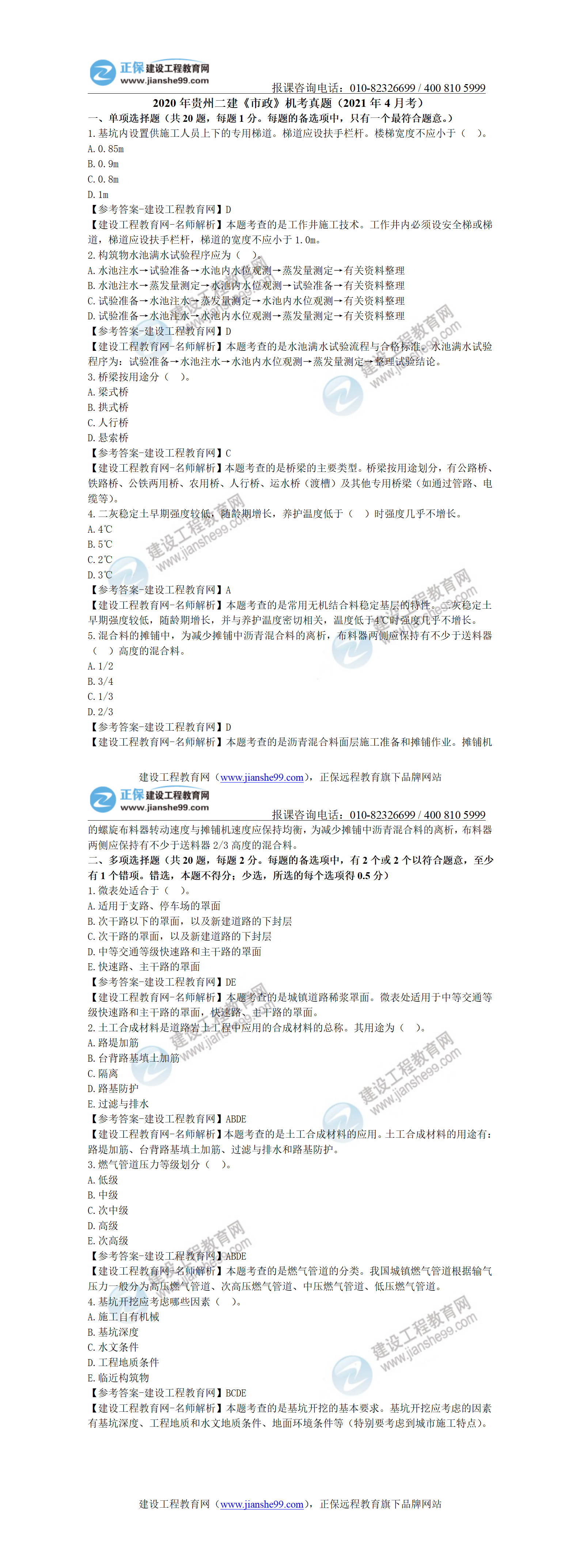 【回憶版】2020年貴州二建《市政》機(jī)考試題(2021年4月考)