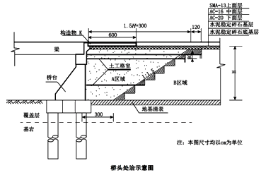 某施工單位承接了一條二級公路的施工,路線全長30.85km,路基寬度為8.5m,路面寬度為2×3.5m。該工程內(nèi)容包括路基、橋梁及路面工程等。為減少橋頭不均勻沉降,防止橋頭跳車,橋臺與路堤交接處按下圖施工,主要施工內(nèi)容包括:地基清表、挖臺階、A區(qū)域分層填筑、鋪設(shè)土工格柵、設(shè)置構(gòu)造物K、路面鋪筑等。路面結(jié)構(gòu)層如下圖所示,B區(qū)域為已經(jīng)填筑完成的路堤填筑區(qū)域。
