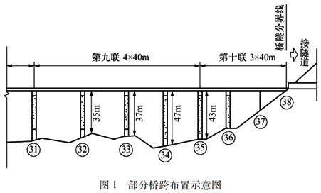 某10聯(lián)現(xiàn)澆預應(yīng)力混凝土連續(xù)箱梁橋地處山嶺重丘區(qū),跨越河谷,起點與另一特大橋相連,終點與一隧道相連,部分橋跨布置示意圖如圖1所示。