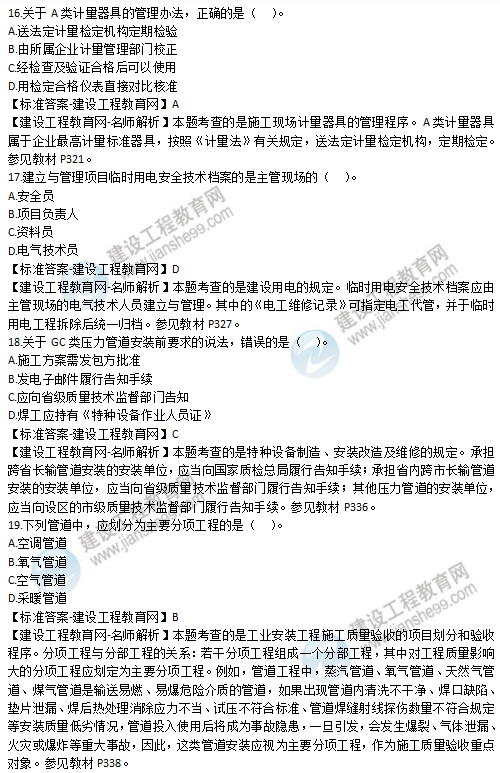 2019年二級建造師機電實務(wù)單選題16-20試題及答案解析