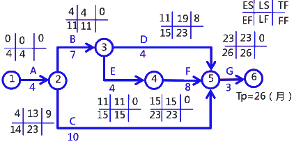 某住宅工程,磚混結(jié)構(gòu),地上7層。項(xiàng)目經(jīng)理決定將整個(gè)施工任務(wù)劃分成6個(gè)工作(A、B、C、D、E、F)。用兩個(gè)圓圈和一個(gè)箭號(hào)圖形表示一項(xiàng)工作,根據(jù)工作之間的緊前和緊后關(guān)系,將工作連接起來(lái),編制了施工進(jìn)度計(jì)劃雙代號(hào)網(wǎng)絡(luò)圖如下(單位:月)
