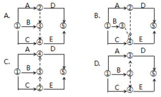 【例題】某工程有A、B、C、D、E五項(xiàng)工作,其邏輯關(guān)系為A、B、C完成后D開(kāi)始,C完成后E才能開(kāi)始,則據(jù)此繪制的雙代號(hào)網(wǎng)絡(luò)圖是( )。