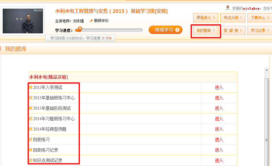 登錄“我的網(wǎng)校我的家”→點(diǎn)擊“題庫”→進(jìn)入“我的題庫”界面→進(jìn)行練習(xí)