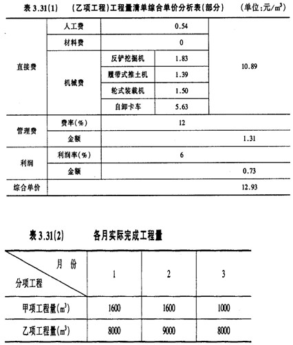 合同工期內(nèi),承包商每月實際完成并經(jīng)工程師簽證確認(rèn)的工程量如表3.31(2)所示。