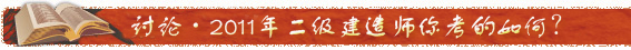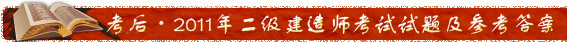 | 2011年二級(jí)建造師考試于6月25日至26日舉行。考試結(jié)束后,歡迎廣大考友們進(jìn)來交流一下,將您記住的試題及您的答案貼出來和大家交流比較!把你考后的經(jīng)驗(yàn)、學(xué)習(xí)心得和廣大考友一起分享吧!~