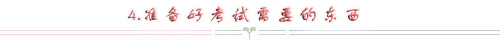 首先是準(zhǔn)考證、身份證這樣重要的證件,另外是考試需要的文具了。多準(zhǔn)備幾只黑色中性筆,不要討論什么圓珠筆能不能用之類的,現(xiàn)在辦公都是使用中性筆了,而且顏色純正比較正式,考試的時(shí)候還是給閱卷老師一個(gè)清爽規(guī)范的感覺(jué)。2B鉛筆、橡皮擦、小刀、計(jì)算器(科學(xué)計(jì)算器足矣);當(dāng)然更重要的是要帶上一塊表,時(shí)刻提醒和控制自己的答題時(shí)間,不要因?yàn)橐粌蓚€(gè)難題浪費(fèi)了時(shí)間、影響了大局。