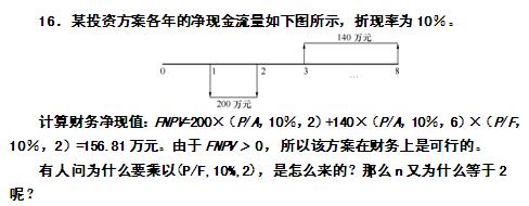 答:此解題方法沒錯。因為3到8年的凈現金流量是等額系列現金流量,應用等額系列現金流量的現值公式(參見教材第9頁1Z101012-12或13公式)可將3到8年的凈現金流量折現到第3年初(即第2年末);又根據財務凈現值的概念(參見教材第24頁)——“……折現到投資方案開始實施時的現值和”,故需繼續(xù)把3到8年已折到第2年末的值,再用一次支付現值公式(參見教材第9頁公式1Z101012-10或1Z101012-11)折現到方案開始實施時,即0期。只有將方案計算期所有凈現金流量按預定的基準收益率折現到0期的現值和,才稱為財務凈現值。