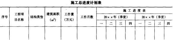 施工總進度計劃可以用橫道圖表達,也可以用網(wǎng)絡圖表達。由于施工總進度計劃只是起控制性作用,因此不必搞得過細,若把計劃編得過細,由于在實施過程中情況復雜多變,調(diào)整計劃反而不便。當用橫道圖表達總進度計劃時,項目的排列可按施工總體方案所確定的工程開展程序排列。橫道圖上應表達出各施工項目的開竣工時間及其施工持續(xù)時間。如下表所示為施工總進度計劃的表格形式。