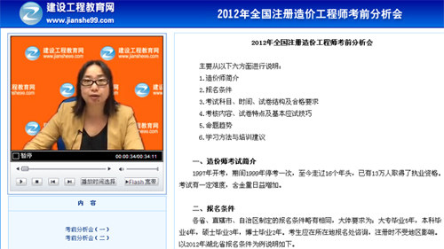 編輯寄語(yǔ):網(wǎng)校老師王英老師特為學(xué)員錄制了2012年全國(guó)注冊(cè)造價(jià)工程師考前分析會(huì),真誠(chéng)希望分析會(huì)對(duì)考生的學(xué)習(xí)和考試有所幫助和啟發(fā),也預(yù)祝學(xué)員能順利通過今年考試,早日加入注冊(cè)造價(jià)師隊(duì)伍。