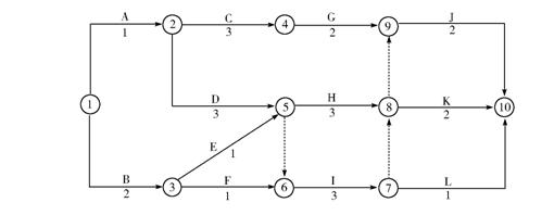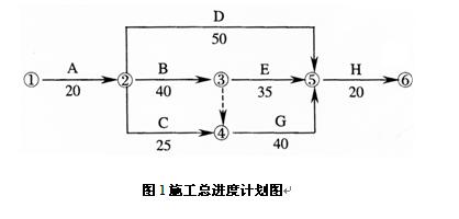 [例1]某建設(shè)單位和施工單位按照《建設(shè)工程施工合同(示范文本)》簽訂了施工合同,合同中約定建筑材料由建設(shè)單位提供,由于非施工單位原因造成的停工,機械補償費為200元/臺班,人工補償費為50元/日工;總工期為120天;竣工時間提前獎勵為3000元/天,誤期損失賠償費為5000元/天。經(jīng)項目監(jiān)理機構(gòu)批準的施工進度計劃如圖1所示(單位:天)。