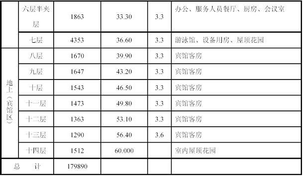 某文化廣場位于天津開發(fā)區(qū)某街以南,某西路以東地塊內(nèi),四面環(huán)路北起某大街,西至某西道,南鄰某路,東至某路,在地塊南側(cè)連接輕軌東站,地基現(xiàn)狀為預(yù)留空地。本工程為酒店、商場、寫字樓、美食、娛樂為一體綜合性高層民用建筑,建筑物南北向324m,東西向114m,主塔樓14 層,基層為7 層,夾層1層,地下一層。建筑面積地上138943m? ,總建筑面積179890m? .剖面層高:地下一層4.8m,一層~五層6.0m,六樓半夾層3.3m,六層6.6m,七層~十二層3.3m,十三層3.6m,十四層坡頂(室內(nèi)屋頂花園)。建筑物總高度87m,(幕墻物架高度109m)。