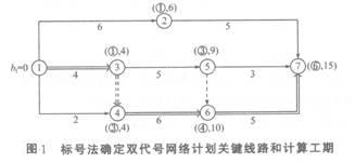 用標號法確定雙代號網(wǎng)絡計劃關鍵線路和計算工期如圖1所示。