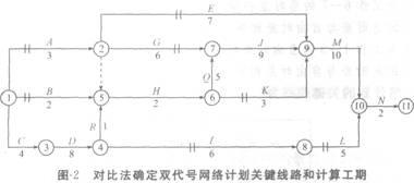 用對比法確定雙代號網(wǎng)絡計劃關鍵線路和計算工期如圖2所示。