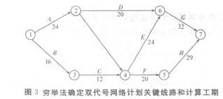 用窮舉法確定雙代號網(wǎng)絡計劃關鍵線路和計算工期如圖3所示。
