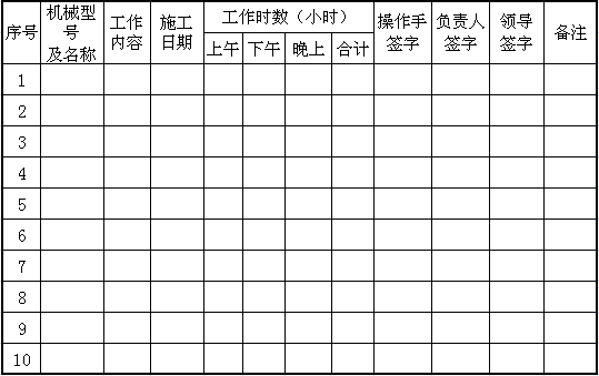 機(jī)械臺(tái)班是單位機(jī)械在一個(gè)工作班(8小時(shí))內(nèi)發(fā)揮的機(jī)械效能。 機(jī)械臺(tái)班統(tǒng)計(jì)表用于統(tǒng)計(jì)機(jī)械型號(hào)及名稱,工作內(nèi)容等內(nèi)容!