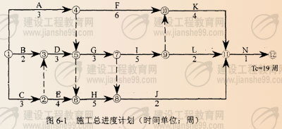 六、某工程,施工合同中約定:工期19周;鋼筋混凝土基礎(chǔ)工程量增加超出15%時,結(jié)算時對超出部分按原價的90%調(diào)整單價。經(jīng)總監(jiān)理工程師批準的施工總進度計劃如圖6-1所示,其中A、C工作為鋼筋混凝土基礎(chǔ)工程,B、G工作為片石混凝土基礎(chǔ)工程,D、E、F、H、I工作為設(shè)備安裝工程,K、L、J、N工作為設(shè)備調(diào)試工作。